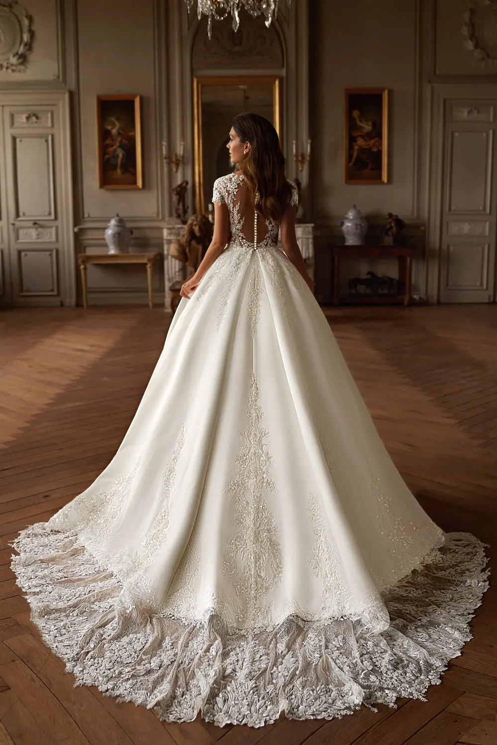 Une robe luxueuse et luxuriante à manches courtes. Le haut de la robe est décoré de dentelle, généreusement brodée de perles, de cristaux et de paillettes. Elle est dotée d'inserts contrastants en maille translucide, ce qui rend la dentelle encore plus accentuée. La robe est parfaite pour les mariées romantiques qui souhaitent créer un look de mariage séduisant, féminin et en même temps classique.